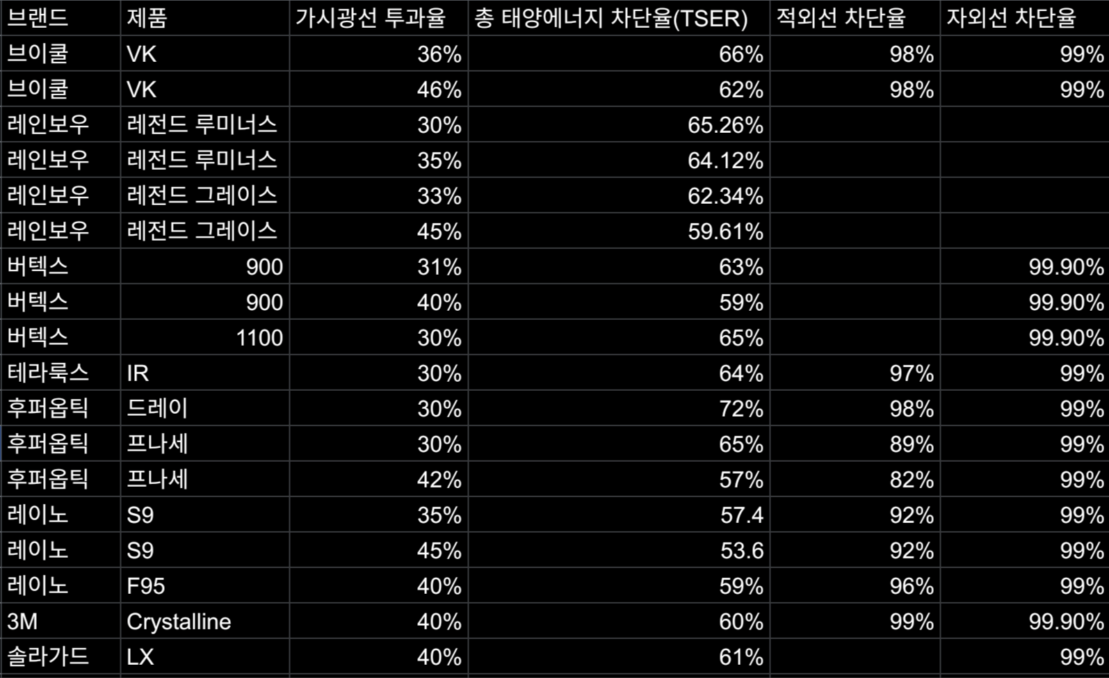 가시광선 투과율 기준 30%, 40%으로, 브랜드별 스펙은 아래와 같음